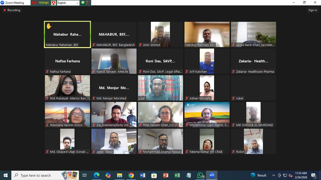 Bangladesh Employers’ Federation (BEF), in collaboration with the Labour Administration and Working Condition Cluster (LAWC) of the ILO Country Office for Bangladesh, organized an online Legal Clinic via zoom on 24 February 2026.