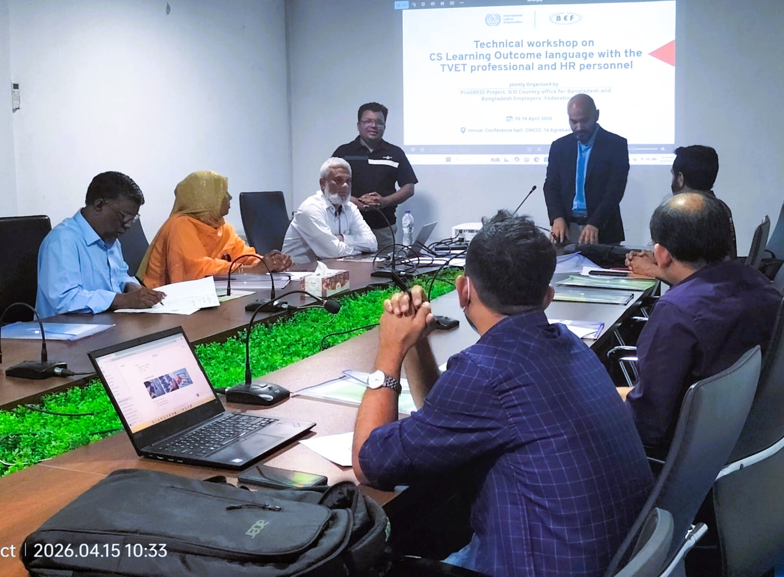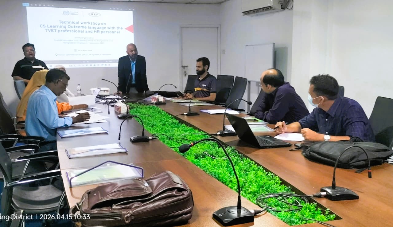 Bangladesh Employers’ Federation (BEF), in collaboration with the ProGRESS Project of ILO, Country Office for Bangladesh, organized and conducted a 2-day long “Technical Workshop on CS Learning Outcome Language with TVET Professionals and HR Personnel” during 15 to 16 April 2026 at the Conference Hall, Chittagong Women Chamber of Commerce and Industry (CWCCI), Chattogram.
