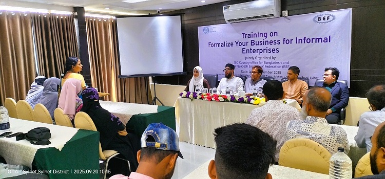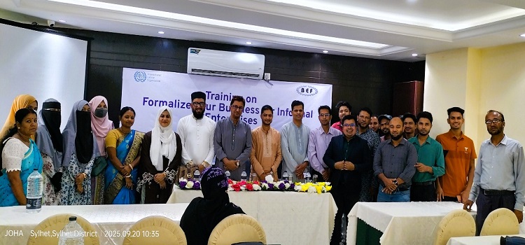 Bangladesh Employers’ Federation (BEF), in collaboration with the ILO, Country Office for Bangladesh and National Association of Small & Cottage Industries of Bangladesh (NASCIB), Sylhet, organized a 3 day-long “Training on Formalize Your Business for Informal Enterprises” during 23-25 September 2025 at Conference Hall, Hotel Valley Garden, Sylhet Tower, Subhani Ghat, Bishwa Road, Sylhet. The training aimed to promote business formalization by enhancing participants’ understanding of its benefits, processes, and challenges. The training was designed to equip informal entrepreneurs with practical steps for transforming their businesses into formal entities.
